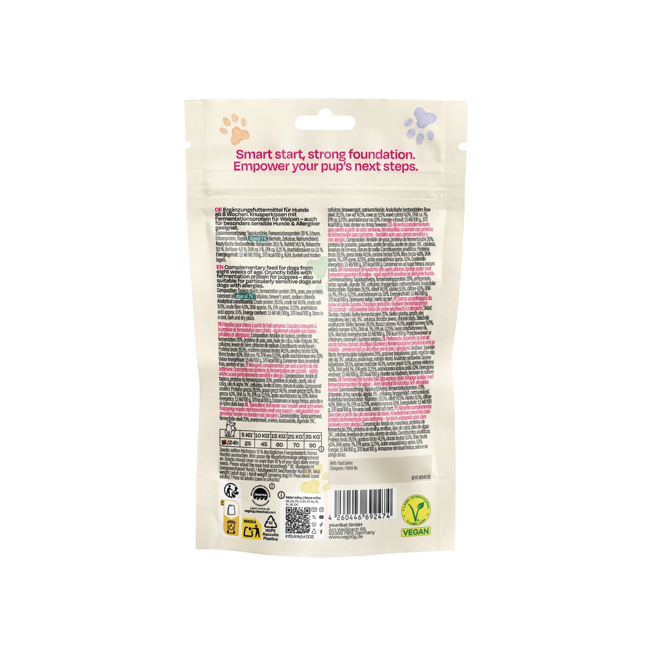 Die VEGDOG Brainy Bites sind kleine, knusprige Trainingssnacks für Hunde jeden Alters – vom Welpen bis zum erwachsenen Hund. Sie sind ideal für Trainingseinheiten, in denen schnelle und häufige Belohnungen gefragt sind.