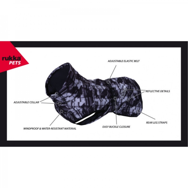 Eine wetterfeste Softshell-Jacke mit einer einzigartigen Musterung, die sorgenfreie Aktivitäten im Freien ermöglicht. Der exzellente Schnitt, der hohe Kragen und der elastische Stoff machen die Jacke zu einem unverzichtbaren Kleidungsstück für aktive Hunde. Das weiche Futter wärmt und schützt die wichtigen Muskelgruppen des Hundes. Dank des Schnellverschlusses mit einer Schnalle lässt sich die Jacke schnell und einfach anziehen. Das elastische und verstellbare Band in der Taille sorgt dafür, dass die Jacke perfekt sitzt, und zusammen mit den elastischen Schlaufen an den Hinterbeinen wird dafür gesorgt, dass die Jacke zu keinem Zeitpunkt verrutscht, auch nicht bei intensiveren Aktivitäten. Das Kleidungsstück ist mit reflektierenden Paspeln und dem Rukka pets Logo versehen.