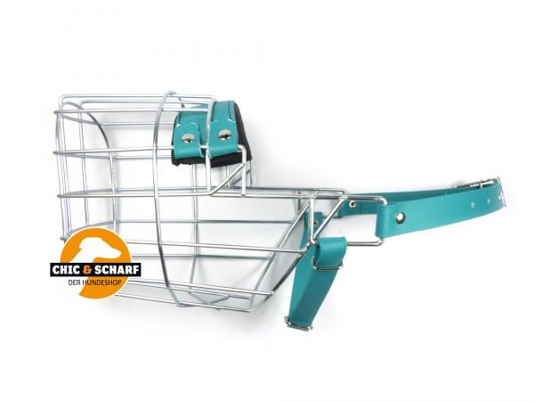 Verzinkter Chopo Drahtmaulkorb mit grünen Biothaneriemen, neoprenunterlegtem Nasenpolster und zusätzlichem Kehlriemen