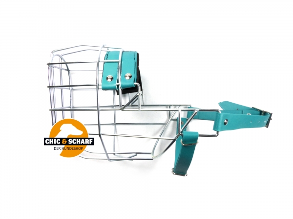 Verzinkter Chopo Drahtmaulkorb mit grünen Biothaneriemen, neoprenunterlegtem Nasenpolster und zusätzlichem Kehlriemen