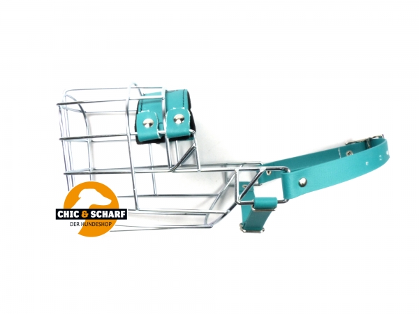 Verzinkter Chopo Drahtmaulkorb mit grünen Biothaneriemen, neoprenunterlegtem Nasenpolster und zusätzlichem Kehlriemen