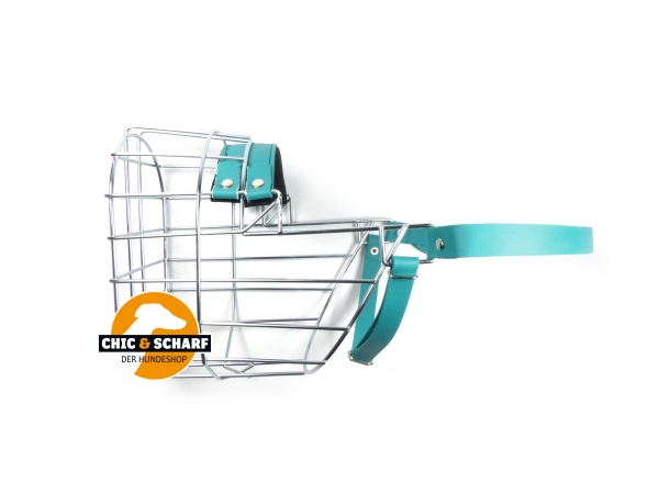 Verzinkter Chopo Drahtmaulkorb mit grünen Biothaneriemen, neoprenunterlegtem Nasenpolster und zusätzlichem Kehlriemen