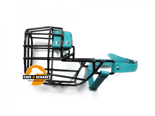 Chopo Drahtmaulkorb mit schwarzer Kunststoffgummierung, grünen Biothaneriemen, neoprenunterlegtem Nasenpolster und zusätzlichem Kehlriemen