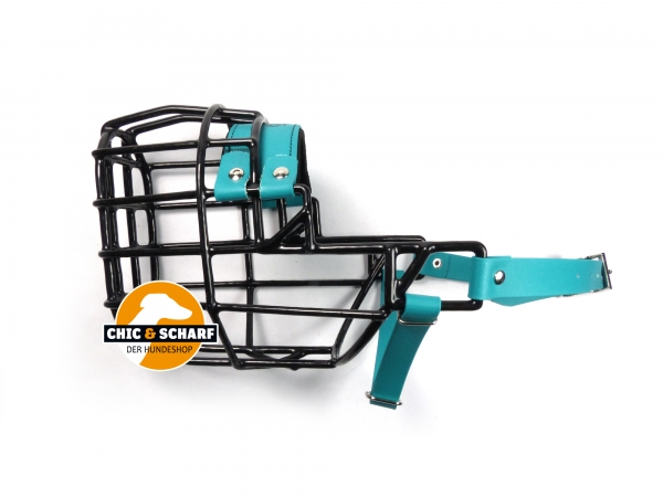 Chopo Drahtmaulkorb mit schwarzer Kunststoffgummierung, grünen Biothaneriemen, neoprenunterlegtem Nasenpolster und zusätzlichem Kehlriemen