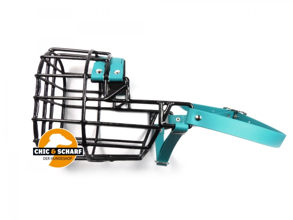 Chopo Drahtmaulkorb mit schwarzer Kunststoffgummierung, grünen Biothaneriemen, neoprenunterlegtem Nasenpolster und zusätzlichem Kehlriemen