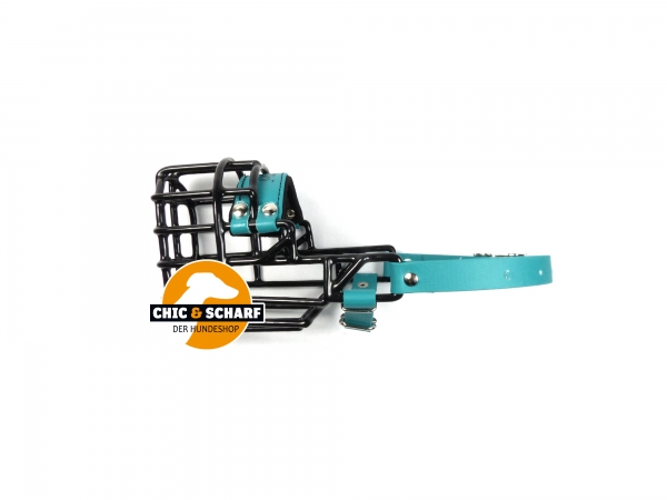 Chopo Drahtmaulkorb mit schwarzer Kunststoffgummierung, grünen Biothaneriemen, neoprenunterlegtem Nasenpolster und zusätzlichem Kehlriemen