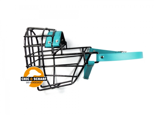 Chopo Drahtmaulkorb mit schwarzer Kunststoffgummierung, grünen Biothaneriemen, neoprenunterlegtem Nasenpolster und zusätzlichem Kehlriemen