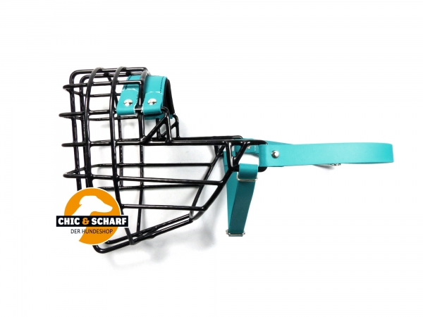 Chopo Drahtmaulkorb mit schwarzer Kunststoffgummierung, grünen Biothaneriemen, neoprenunterlegtem Nasenpolster und zusätzlichem Kehlriemen