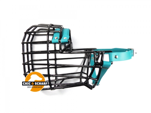 Chopo Drahtmaulkorb mit schwarzer Kunststoffgummierung, grünen Biothaneriemen, neoprenunterlegtem Nasenpolster und zusätzlichem Kehlriemen
