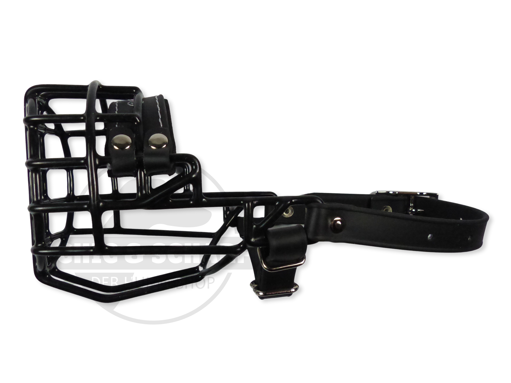 Chopo Drahtmaulkorb mit schwarzer Kunststoffgummierung, schwarzen Biothaneriemen, neoprenunterlegtem Nasenpolster und zusätzlichem Kehlriemen