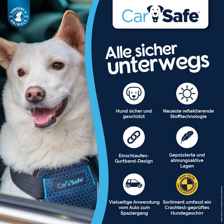 Das CarSafe Crash Tested Dog Harness wurde speziell für den sicheren Transport von Hunden im Auto entwickelt. Es ist crash-getestet und zertifiziert bis zu 32 kg (70 lbs) und wird direkt am Sicherheitsgurt des Fahrzeugs befestigt. So entsteht ein stabiles Anschnall-System, das deinen Hund während der Fahrt sichert.