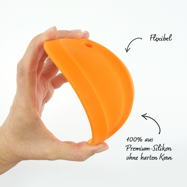 Der Teigschaber besteht zu 100% aus Silikon und ist sehr flexibel - ohne harten Kern. Somit passt sich der Spatel an runden und ovalen Stellen perfekt an. Das premium Silikon ist lebensmittelecht und BPA-frei.