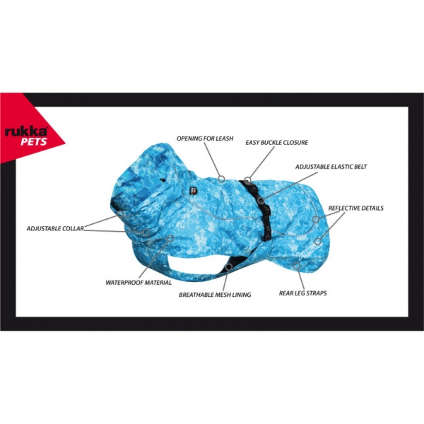 Rukka pets Regenmantel. Frontbereich und Saum sind abgedeckt. Reflektierende Details. Kragen und Taille verstellbar. Wasserdichtes Material. Zusätzlicher abnehmbarer Röhrenkragen. Komfortables und atmungsaktives Netzfutter.
