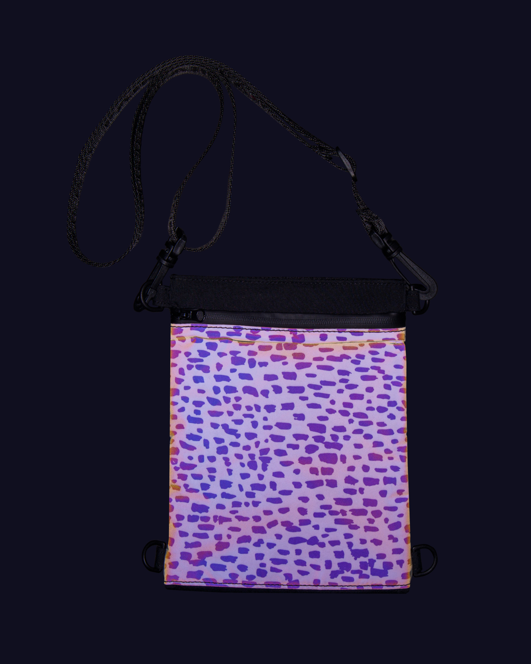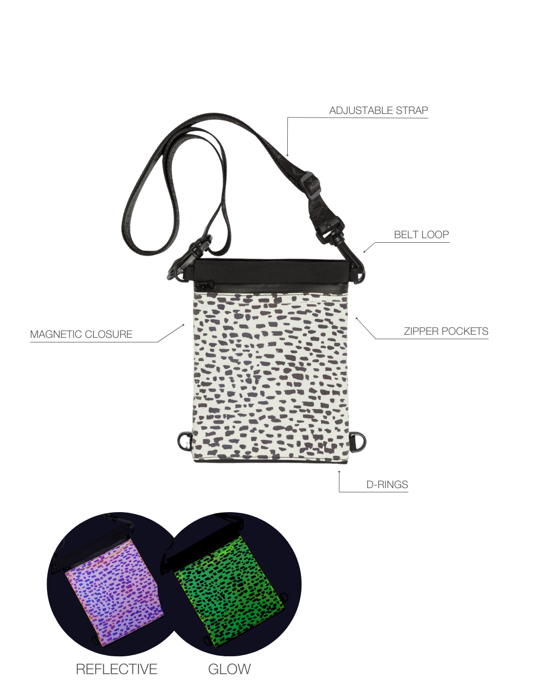Mit dem verstellbaren Riemen, einem praktischen Gürtelhaken und den stabilen D-Ringen kannst du den Beutel flexibel tragen – so passt er sich perfekt deinem Alltag an. Das reflektierende Material mit Glow-in-the-dark-Effekt sorgt zusätzlich für Sichtbarkeit und Sicherheit bei schlechten Lichtverhältnissen.